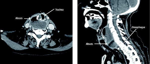 En 83-årig kvinde blev indlagt til hoftealloplastik. På grund af problemer med spinalanalgesien skiftede man til generel anæstesi. Der blev gjort fem forsøg inden succesfuld intubation. To dage efter indgrebet klagede patienten over svag stemme, synkebesvær og smerter til højre øre. På sjettedagen postoperativt blev der foretaget øre-næse-hals-tilsyn, hvor man fandt hævelse af pharynx' bagvæg. På grund af patientens penicillinallergi indledte man en erythromycinbehandling. På niendedagen udviklede patienten synkestop, og hun blev derfor overflyttet til øre-næse-hals-afdelingen. Her foretog man en akut computertomografi af halsen, som viste en 6 ×7× 3 cm stor absces mellem larynx og columna cervicalis. Den afklemte fuldstændig oesophagus. Man udtømte samme dag 100 ml pus. Postoperativt blev patienten behandlet med cefuroxim, metronidazol samt solumedrol intravenøst. Dyrkning viste efterfølgende nonhæmolytiske streptokokker.