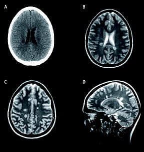 Computertomografi (CT) af cerebrum viste to hypodense områder omkring 1 cm store i højresidig corona radiata og centrum semiovale uden opladning efter kontrastindgift ( A ). Efterfølgende magnetisk resonans (MR)-skanning viste på T2-vægtet optagelse hyperintense, ovoide forandringer op til 1 cm store i hvid substans periventrikulært ( Dawson fingers ) og i corpus callosum med opladning i en enkelt forandring efter kontrastindgift ( B + C + D ). Forandring-erne blev tolket som en akut, demyeliniserende lidelse suspekt for multipel sklerose (MS) [1]. Spinalvæsken viste let forhøjet immunglobulin G-indeks, men fravær af oligoklonale bånd, hvilket er foreneligt med en autoimmun reaktion, der disponerer for udvikling af MS.
