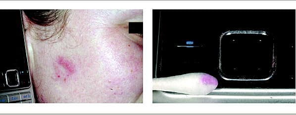 Ved en objektiv undersøgelse blev der fundet eksem i et kvadratisk område på begge kinder (venstre billede). Områderne svarede til funktionstastens metalramme på patientens mobiltelefon. Denne blev fundet positiv ved en dimethylglyoximtest (højre billede ). Dimethylglyoximtesten er en nikkelanalyse, som patienten selv kan udføre. Et testsæt koster ca. 100 kr. på apoteket. En vatpind fugtet med testmediet gnides på metalgenstanden. Hvis vatpinden bliver lyserød, indeholder metalgenstanden nikkel i en klinisk betydningsfuld mængde.