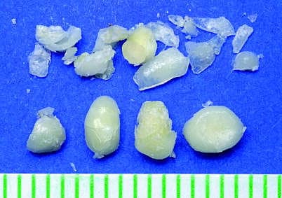 En tiårig dreng havde igennem fire år haft hævelse og smerter i højre regio submandibularis. En computertomografi (CT) viste en sten på 2,5 mm i diameter i højre glandula submandibularis. En ultralydskanning viste et konkrement på 3 × 3,8 mm.