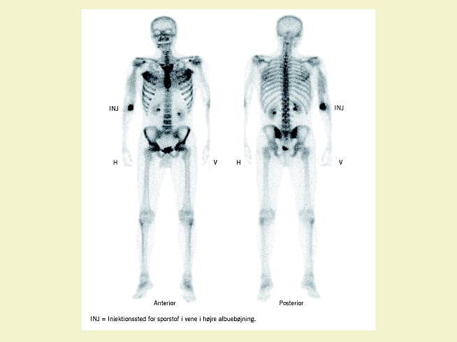 Knogleskintigrafi med 99mTc-HDP er en undersøgelse, hvor optagelse af sporstoffet primært afhænger af hastigheden af knoglenydannelse samt af blodgennemstrømningen. En række patologiske processer i skelettet giver således anledning til øget aktivitetsoptagelse Figur 1.