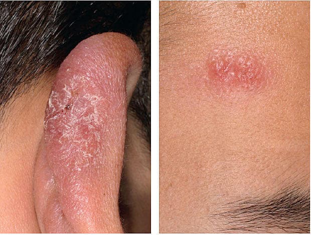 En 18-årig tidligere rask afghansk flygtning blev henvist til dermatologisk vurdering pga. længerevarende og diagnostisk uafklarede hudgener i form af uømme og ikkekløende forandringer på henholdsvis højre øre og i panden. Ved en objektiv undersøgelse sås et rødt, skællende infiltrat på helix og et eksematøst, velafgrænset element over højre øje. En biopsi fra elementerne viste diffus histiocytær inflammation og intra-cytoplasmatiske Leishman-Donovan-legemer, og dia-