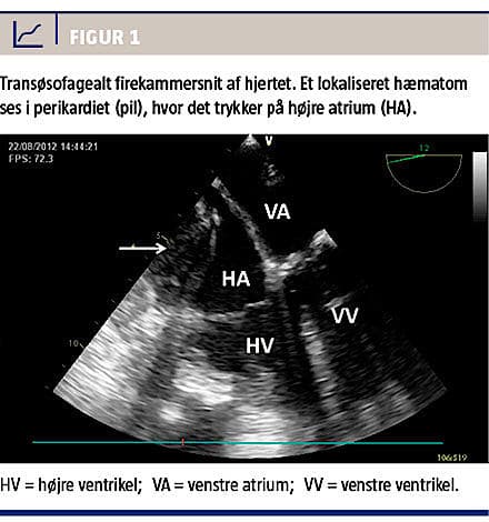 på 110 min–1, mens et akut ekg ikke viste tegn til iskæmi/low voltage. En arterienål blev anlagt, og blodtrykket var 55/30 mmHg. En fokuseret ekkokardiografi [2] viste en væskebræmme på 2-3 cm i perikardiet, hvorfor patienten blev overført akut til en kardiologisk afdeling på mistanke om hjertetamponade. Her genfandt man væskebræmmen omkring hjertet. Ved en grundig ekkokardiografi udført af en kardiolog og ved opnåelse af flere projektioner sås der intet tegn til, at hverken ventrikler eller atrier blev komprimeret af perikardievæsken. Dette gav anledning til usikkerhed om den udløsende årsag til patientens shocktilstand. Kort efter var hendes tilstand klinisk forværret med blåmarmorerede underekstremiteter og pulsstigning til 140 min–1. Da perikardievæsken så ud til at indeholde et større, fast element, vurderede man, at den var utilgængelig for perikardiocentese med nåleteknik, og der blev derfor foretaget akut, kirurgisk udtømning af et delvist organiseret hæmatom. Ved udtømningen normaliseredes patientens hæmodynamik øjeblikkeligt. Fire dage senere blev hun udskrevet uden men. Kardiologisk opfølgning, herunder ekkokardiografi, afslørede ikke den udløsende årsag til hjertetamponaden.