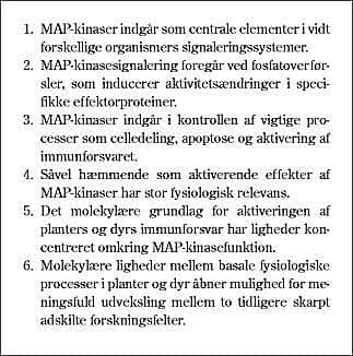 Helt ny er opdagelsen af, at både planter og dyr benytter en fælles klasse af signalmolekyler, MAP-kinaserne, når deres immunforsvar skal aktiveres. MAP-kinaserne blev op gennem 1990'erne kendt som centrale regulatorer af fx celledeling, programmeret celledød og T-celledifferentiering. Udvikling af lægemidler rettet specifikt mod MAP-kinaser er derfor i dag et stort tema i den farmakologiske industri. Vi vil her fokusere på genetisk analyse af MAP-kinasers funktion i pattedyr og planter med særlig vægt på de ligheder, der tegner sig både mekanistisk og fysiologisk. Som fundament vil vi starte med at gennemgå de basale molekylære mekanismer, MAP-kinaserne benytter, når de modtager og viderebringer cellulære signaler.