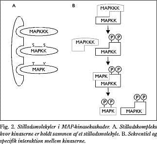 MAP-kinaserne ændrer ikke bare andre proteiners aktivitet ved fosfatoverførsel. De bliver også selv aktiveret ved fosfatoverførsel, og MAP-kinasernes aktivatorer bliver igen aktiveret ved fosfatoverførsel. MAP-kinaser virker altså som det sidste led i en tredelt fosfatoverførselskaskade , hvis komponenter tilsvarende kaldes MAP-kinaser (MAPK), MAP-kinase-kinaser (MAPKK) og MAP-kinase-kinase-kinaser (MAPKKK) (Fig. 1B ).