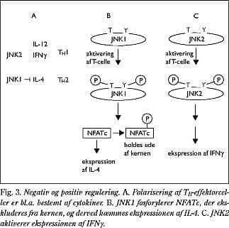 Yang et al (5) fandt, at aktiverede TH -celler fra jnk2 -mus er svækkede i dannelsen af TH 1-effektorceller i forhold til raske kontrolmus. Polariseringen af TH -celledifferentieringen er bl.a. bestemt af cytokiner som interferoner (IFN) og interleukiner (IL). IL-12 og IFNg er nødvendige for dannelsen af TH 1-effektorceller, mens IL-4 er nødvendig for TH 2-differentieringen (Fig. 3 ). Netop produktionen af IFNg er stærkt reduceret i jnk2 -T-celler. Tilsætning af IFNg under differentiering i jnk2 bragte balance i regnskabet mellem dannelsen af TH 1- og TH 2-effektorceller, der fik de samme værdier som kontrollen. JNK2 er altså en positiv regulator af produktionen af IFNg under differentieringen og er dermed nødvendig for dannelsen af TH 1-effektorceller (Fig. 3C ).