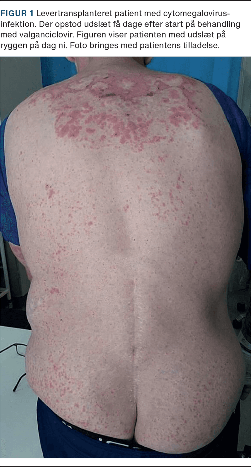 En 49-årig mand var fire mdr. tidligere levertransplanteret pga. alkoholisk levercirrose; og han fik derfor immunsupprimerende behandling med tacrolimus, mycophenolatmofetil (MMF) og prednisolon. Da CMV-serostatus var donor+/recipient- ved transplantationen, havde patienten høj risiko for CMV-infektion, og han havde derfor fået tre mdr.s profylaktisk valganciclovir givet p.o. Fire mdr. efter transplantation var hans CMV-DNA-niveau positivt (300 IE/ml), og han startede behandling med p.o. givet valganciclovir 900 mg × 2 dagl. Samtidig var MMF-behandlingen blevet pauseret (på dag nul). På dag to fik patienten et makulopapuløst udslæt, der initialt blev set an. Trods syv dages valganciclovirbehandling steg CMV-DNA-niveauet til 31.800 IE/ml, og tacrolimusdosis blev reduceret. Patienten blev indlagt med progredierende udslæt og behov for observation af behandlingsrespons. Han havde ingen symptomer på CMV-infektion, og han var tidligere hudrask uden disposition til hudlidelser og uden komorbiditet. På mistanke om medikamentelt udslæt udløst af valganciclovir var det nødvendigt at skifte behandling til foscarnet. Da udslættet fortsat progredierede, blev tilstanden på dag ni vurderet af dermatologer, som beskrev udbredt makulopapuløst udslæt i et annulært mønster universelt på krop og ekstremiteter. I håndfladerne var der enkelte bullae og kokardelignende formationer. På huden på øvre ryg var der positivt Nikolskis tegn (Figur 1). Tilstanden blev betragtet som mulig TEN, som er en potentielt livstruende og oftest medicinudløst sygdom. Alternativt blev der overvejet erythema multiforme (EM). Da EM ikke altid klinisk kan skelnes fra TEN, blev der taget stansebiopsi til frysemikroskopi og histologi.