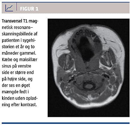 Differentialdiagnostisk kan lignende asymmetrisk hypertrofi ses ved en række overvækstsyndromer. Pleksiformt neurofibrom med ansigtsasymmetri ved neurofibromatose type 1 udvikles oftest først gradvist i de tidlige barneår [3]. Lignende asymmetri kan opstå ved Beckwith-Wiedemanns syndrom, Klippel-Trénaunay-Webers syndrom, Proteus’ syndrom samt syndromer, der er associeret til phosphatase and tensin homolog (PTEN)-mutation og encefalokraniokutan lipomatose. Patienten i sygehistorien opfyldte ingen kriterier for disse syndromer.