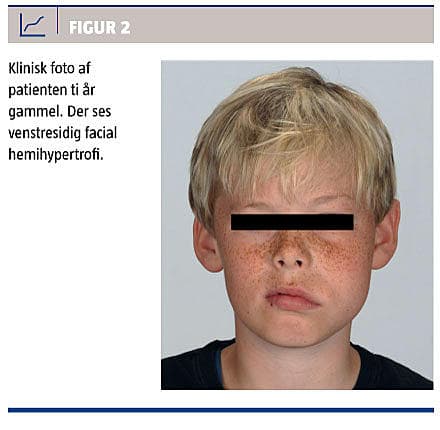 Hypertrofien af venstre kind og gumme progredierede i takt med drengens vækst. Da drengen var i femårsalderen, blev der igen foretaget en MR-skanning, hvor der blev fundet uændret asymmetri med forstørret venstre ansigtshalvdel. Han blev henvist til en specialtandlæge, blev fulgt med hyppige kontroller og fik tandbøjle. Ved tiårskontrollen var forandringerne forholdsmæssigt uændrede (Figur 2). Han var psykomotorisk fuldstændig alderssvarende udviklet.
