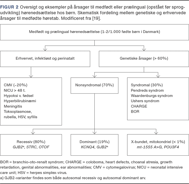 Andelen af børn med hørenedsættelse med genetisk baggrund er stigende, i takt med at erhvervede årsager kan behandles og forebygges mere effektivt [18, 19]. Hørenedsættelse med genetisk baggrund kan underinddeles i syndromal og nonsyndromal hørenedsættelse, afhængigt af om andre symptomer eller misdannelser kan påvises. Den nonsyndromale gruppe er størst og udgør ca. 70%. Nonsyndromal eller isoleret hørenedsættelse er med udtalt heterogen genetisk baggrund, hvor der er beskrevet > 150 gener som monogenetisk forårsagende. En opdateret liste kan ses på Hereditary Hearing Loss Homepage [20]. Autosomal recessiv arvegang ses hyppigst (hos omtrent 80%), men autosomal dominant X-bunden arvegang og mere sjældent mitokondriel arvegang ses også. Syndromal hørenedsættelse er beskrevet hos > 400 forskellige syndromer, ligeledes med forskellig arvegang [18, 19]. Syndromale hørenedsættelser håndteres i tværfagligt samarbejde typisk med øjen- og børnelæger.