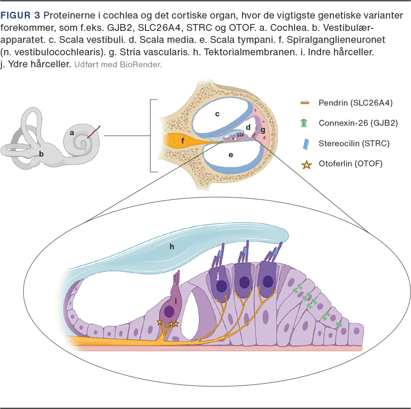 STRC(-CATSPER2)-varianter diagnosticeres hyppigt som årsag til arveligt betinget høretab, og denne gruppe er den næsthyppigste monogenetiske årsag til nonsyndromal sensorineural hørenedsættelse [24]. STRC koder for proteinet stereocilin, som fungerer som krydsbindinger på toppen af sterocilierne og er vigtig for stabiliteten i de ydre hårceller i cochlea (Figur 3). Fænotypisk ses et ofte symmetrisk, stabilt, mildt til moderat høretab, som typisk kan rehabiliteres med konventionelle høreapparater, og oftest er høretabet ikke så udtalt, at CI kommer på tale. Er der tale om en STRC-deletion, som også involverer CATSPER2 (som er relevant for motilitet af spermatozoer), kan det medføre nedsat fertilitet hos drengebørn [25].