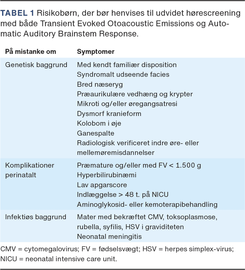 Den neonatale hørescreening blev indført i Danmark i 2005 for at identificere medfødte hørenedsættelser og iværksætte rettidig og korrekt behandling af hørenedsættelsen [4, 5] samt at forebygge udviklingsmæssige forsinkelser relateret til høretabet [6, 7]. Tidligere anvendtes BOEL-testen (»Blikket Orienteret Efter Lyd«) i syv-nimånedersalderen hos sundhedsplejersken som hørescreening, men BOEL-testen er ikke specifik eller sensitiv nok til at identificere hørenedsættelse hos børn. I dag benyttes screeningsmetoderne Transient Evoked Otoacoustic Emissions (TEOAE) eller Distortion Product Otoacoustic Emissions (DPOAE) og Automatic Auditory Brainstem Response (AABR) til identifikation af medfødt høretab.