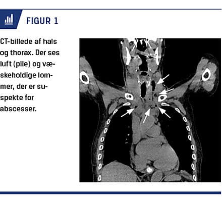 Ved næste besøg havde han feber, og smerterne i venstre side af halsen var uændrede. Han blev derfor akut indlagt. Biokemien viste bakteriel infektion med et trecifret C-reaktivt protein-niveau, og han blev sat i peroral behandling med penicillin. Der blev på indlæggelsesdagen udført direkte laryngoskopi og fleksibel øsofagoskopi i generel anæstesi (GA), hvor man fandt intakte slimhinder og intet fremmedlegeme. Man fandt ligeledes ingen tegn til infektion i mund eller svælg. Infektionstallene var fortsat stigende, og behandlingen blev skiftet fra penicillin til intravenøst givet cefuroxim og metronidazol. En CT af hals og thorax med kontrast viste i venstre side af halsen et subkutant emfysem, der strakte sig fra glandula thyroidea ned til mediastinum. Kontrastvæsken passerede frit til ventriklen, så der var ingen perforation. Pga. tiltagende febrilia, stigende infektionsparametre og rødme på halsen og brystet blev cefuroxim erstattet med piperacillin/tazobactam. CT blev gentaget og viste fortsat emfysem og væskeholdige lommer, der formentlig udgik fra venstre forside af øsofagus ud for glandula thyroidea (Figur 1). Der blev derfor planlagt kirurgisk intervention i GA. Der blev incideret horisontalt midt imellem cricoidet og jugulum. Abceslommer blev opsøgt på begge sider af halsen og retrosternalt. Ved tryk på halsen og brystet fremkom der massive mængder af pus. Der blev lagt nøgendræn ned mod klaviklen bilateralt, og retrosternalt blev der pakket med meche. De efterfølgende dage blev der kvitteret store mængder pus fra drænene. Der blev dagligt udført oprensning og meche-skift i GA. En CT af hals og thorax seks dage efter det første kirurgiske indgreb viste væsentlig regression af abscesserne. Der var dog tilkommet bilateral pleuravæske, og der blev udtømt en liter klar, strågul væske. Dyrkning var uden vækst. Der blev ligeledes podet fra pus i flere omgange, uden at der blev fundet vækst af patogene bakterier. Ni dage efter incidering blev drænene fjernet og antibiotika seponeret. Patienten blev udskrevet og fulgt ambulant i yderligere en måned til såret på halsen var helt lukket.