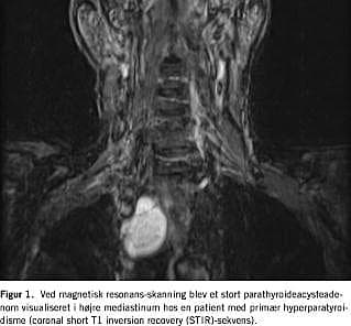 Summary Mediastinal parathyroid cystadenoma: a rare cause of primary hyperparathyroidism Ugeskr Læger 2006;168(35):2921-2922 Parathyroid cysts located in the mediastinum are rare. They may be non-functioning or associated with primary hyperparathyroidism (PHPT). We present a patient with persistent PHPT despite previous parathyroid surgery. Parathyroid scintigraphy with 99m Tc sestamibi showed no focus with radioactivity retention, but MRI revealed a large parathyroid cystadenoma in the mediastinum, which was successfully removed. In general, MRI is not the first choice for parathyroid imaging, but when the adenoma is localized at ectopic sites, MRI is a good imaging modality.