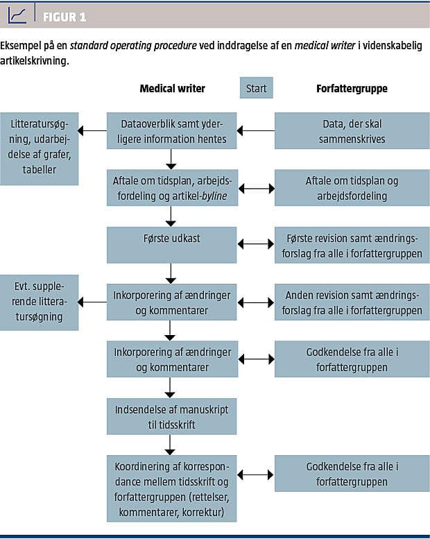 Der er udarbejdet uofficielle anbefalinger for samarbejdet mellem medical writers og forfattergruppen, som har leveret data, men det kan organiseres efter parternes behov [11]. Det anbefales, at der udarbejdes en detaljeret standard operating procedure, hvori arbejdsprocessens elementer og ansvarsfordelingen beskrives (Figur 1). Det vil oftest være en medical writer, der udarbejder første artikeludkast efter dialog med forfattergruppen, og videre kritisk revision af manuskriptet sker i samarbejde med forfattergruppen. I en undersøgelse blandt AMWA’s medlemmer svarede 91%, at de involverede forfatteren, inden de udarbejdede dispositionen til originalartikler, mens 75% involverede forfatteren, inden de udarbejdede dispositionen til reviewartikler [12]. Tilsvarende svarede 5%, at de involverede forfatteren, efter at første artikeludkast til originalstudier var skrevet, mens 11% først involverede forfatteren, efter at første udkast til en reviewartikel var skrevet [12].