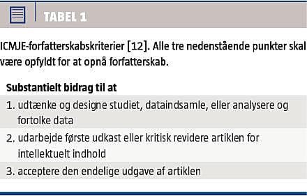 En medical writer er som udgangspunkt ikke berettiget til at være medforfatter i henhold til de forfatterskabskriterier, der er udarbejdet af International Commitee of Medical Journal Editors (ICMJE) (Tabel 1), da en medical writer sjældent vil have bidraget til enten at udtænke eller designe studiet, dataindsamle eller analysere og fortolke data og oftest først bliver inddraget i artikelskrivningen [13]. ICMJE anbefaler, at anvendelse af en medical writer angives specifikt i artiklens taksigelser, hvis vedkommende ikke er berettiget til medforfatterskab.