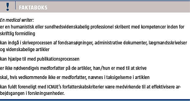 En medical writer er en professionel forfatter med sproglige og skivemæssige kompetencer samt basal viden om medicin og forskningsmetoder. En medical writer kan indgå i skriveprocessen for ansøgninger, lægmandsskrivelser og ikke mindst videnskabelige artikler i samarbejde med artiklernes forfattere. Anvendelsen af medical writers nationalt har indtil videre primært begrænset sig til medicinalindustrien, mens man internationalt i højere grad har medical writers ansat til at effektivisere skrive- og publikationsprocessen [3]. Formålet med denne artikel er at præsentere og diskutere de fordele og ulemper, der kan være forbundet med at inddrage medical writers i sundhedsvidenskabelig forskningsformidling.