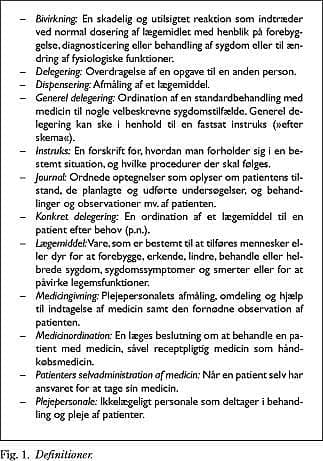 Formålet med denne oversigt er dels at resumere centrale love og regler, som regulerer håndteringen af lægemidler på kliniske afdelinger, dels at udpege områder hvor lokale instrukser skal eller med fordel vil kunne supplere lovgivningen. Fokus rettes mod love og regler af generel betydning for arbejdet på de kliniske afdelinger, idet regler, der gælder for særlige personalegrupper eller særlige lægemidler, fx regler om gravide kvinders arbejdsmiljø eller håndtering af cytostatika eller radioaktive isotoper, ikke er medtaget. Vedrørende lægemidler til klinisk afprøvning henvises til kapitel 5 i lov om lægemidler (2) og Lægemiddelstyrelsens regler. Vi har grupperet de forskellige regler efter den personalegruppe, som reglerne er rettet imod, men inddelingen er ikke eksklusiv. For eksempel er generelle regler vedrørende ophældning og uddeling af lægemidler nævnt under plejepersonale, men gældende for alle faggrupper, som varetager denne funktion. Definitioner er angivet i Fig. 1 . Den fulde lovtekst kan læses på Retsinformations hjemmeside (www.retsinfo.dk, jan. 2002).