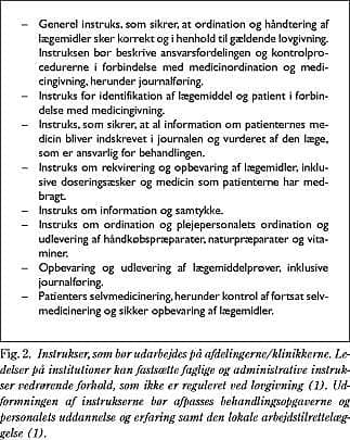 Håndtering af lægemidler på de kliniske afdelinger sker i et samspil imellem den enkelte patient og forskellige fagpersoner. Generelt er ordination af lægemidler forbeholdt læger, mens opmåling (dispensering) og omdeling (administration) af lægemidlerne fortrinsvis hører under sygeplejerskernes arbejdsområde. Farmaceuter og andre faggrupper kan varetage nogle af disse funktioner, fx dispensering af antibiotika til infusion. Samspillet imellem de personer, som er involveret i processen, herunder fordeling af ansvar og kompetence, er reguleret af de autorisationslove, der er gældende for de pågældende sundhedspersoners faglige virksomhed, samt af administrative eller faglige instrukser, der er fastsat lokalt (1). Med baggrund i tiltagende krav om sikkerhed og kvalitet i det kliniske arbejde har udarbejdelsen af instrukser fået voksende betydning. Flere lovtekster indeholder præcise anvisninger af instrukser, der bør udarbejdes lokalt, mens andre indeholder mere generelle angivelser af, at en proces skal foregå i henhold til gældende lov.