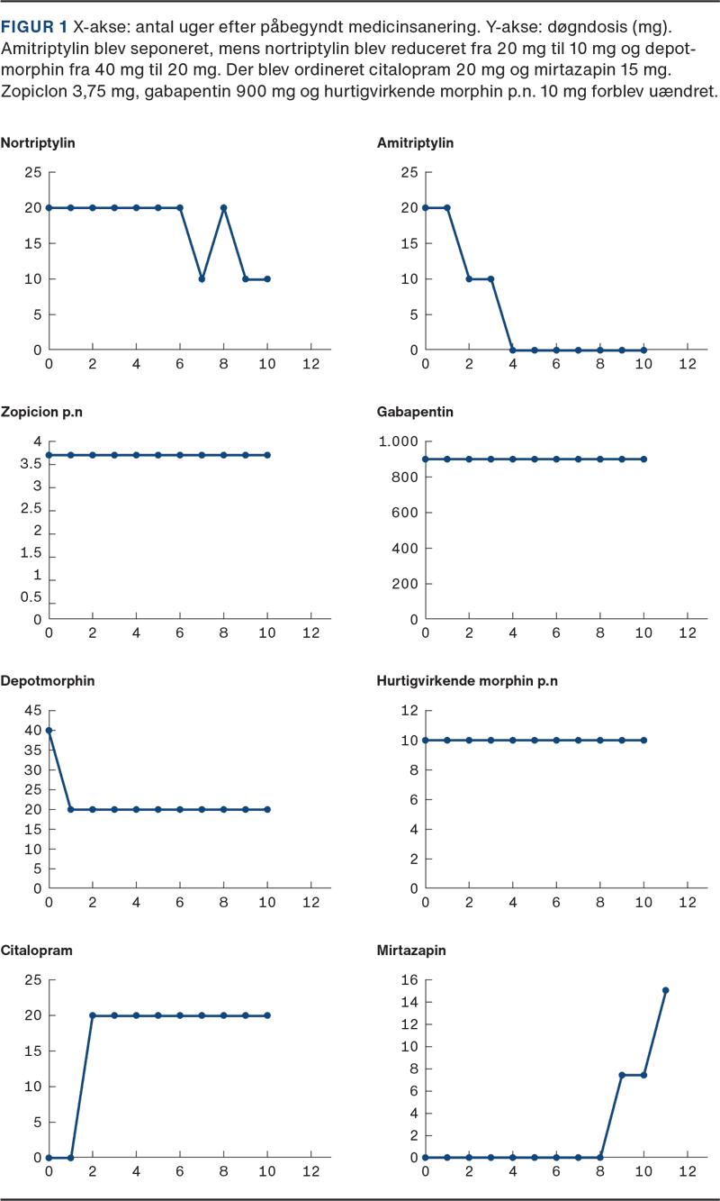 Tre år senere blev patienten indlagt på medicinsk afdeling med konfusion og pneumoni. Medicinlisten var uændret. Under indlæggelsen blev amitriptylin og depotmorphin nedtrappet. Patienten blev henvist til udkørende geriatrisk team (UGT) med henblik på fortsat medicinnedtrapning efter udskrivelse. Over fire måneder blev depotmorphin og nortriptylin reduceret, mens amitriptylin blev seponeret (Figur 1). Gabapentin, zopiclon og hurtigvirkende tablet morphin p.n. forblev uændret.