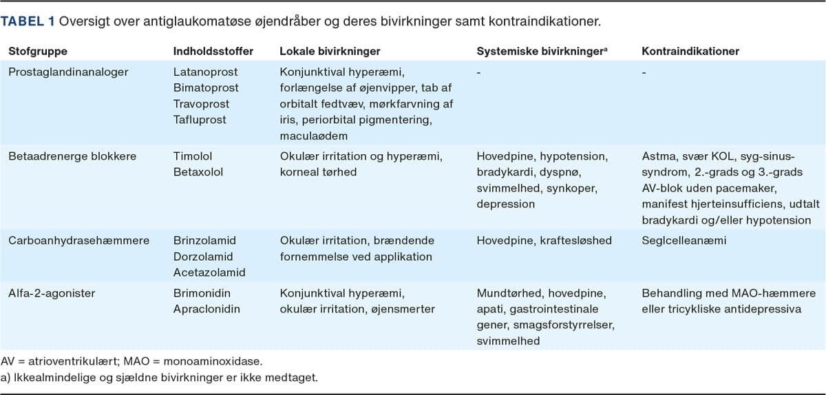 Glaukom er den hyppigste årsag til irreversibel blindhed på verdensplan [1] og er en progredierende opticusneuropati, der ubehandlet forårsager et irreversibelt tab af ganglieceller og nervefibre i nethinden, hvilket kan medføre synsfeltsdefekter og i sidste ende blindhed. At sænke det intraokulære tryk er den eneste behandling, der endnu er dokumenteret effektiv i behandlingen af glaukom, og dette kan gøres både medicinsk og kirurgisk. Medicinsk behandling af glaukom i form af øjendråber er langt den mest udbredte, og i 2011 brugte 3,8% af Danmarks befolkning over 50 år antiglaukomatøse øjendråber [2]. Mange patienter med glaukom har ingen sygdomsfølelse og oplever bivirkninger ved øjendråberne, hvorfor komplians kan være en udfordring, da manglende øjendrypning kan medføre progression af øjensygdommen. Med denne statusartikel vil vi opdatere læger i alle specialer på den aktuelle medicinske behandling af glaukom med fokus på lokale og systemiske bivirkninger og interaktioner til de forskellige øjendråber.