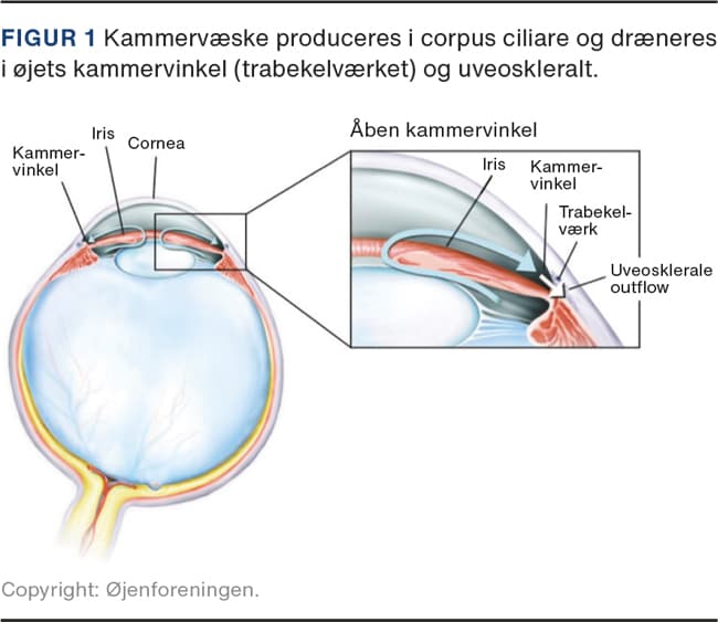 Trykket i øjnene (det intraokulære tryk) er en balance mellem væskeproduktionen i corpus ciliare bag iris og den uveosklerale og trabekulære drænage i øjets kammervinkel (Figur 1). Det normale intraokulære tryk ligger på 10-21 mmHg [3]. Hvis drænagen gennem trabekelværket er nedsat, vil det intraokulære tryk stige. Hvis det intraokulære tryk er højere, end hvad de retinale ganglieceller og disses aksoner kan tåle, vil der komme skade på disse strukturer. Aksonernes følsomhed varierer mellem individer, så nogle patienter får glaukom, selvom det intraokulære tryk er inden for normalområdet (normaltryksglaukom) – andre patienter får ikke glaukom, selvom det intraokulære tryk er over normalområdet (okulær hypertension).