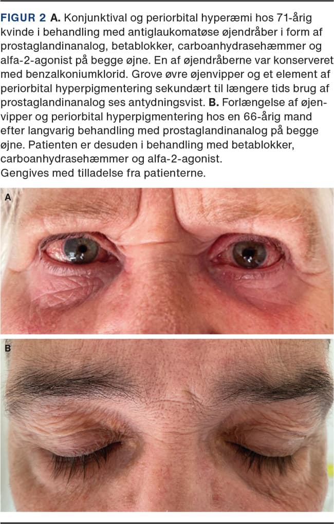 Prostaglandinanaloger reducerer det intraokulære tryk ved at øge outflow af kammervæske via den uveosklerale pathway [14]. Prostaglandinanaloger har derudover den fordel, at de kun skal administreres én gang dagligt og meget sjældent giver systemiske bivirkninger. Dog oplever mange patienter lokale bivirkninger i form af konjunktival hyperæmi, forlængelse af øjenvipperne, tab af orbitalt fedtvæv, mørkfarvning af iris og periorbital pigmentering [15] (Figur 2). Hvis effekten af prostaglandinanalogerne ikke er tilfredsstillende, kan man vælge at skifte til en anden øjendråbe inden for samme eller en anden stofgruppe eller lægge en anden stofgruppe oven i behandlingen. Andetvalget vil ofte være et betablokerende middel, der administreres en eller to gange dagligt. Betablokkere nedsætter produktionen af kammervæske fra corpus ciliare [16]. Patienter, som er i lokalbehandling med betablokkere, kan opleve bivirkninger i form af bradykardi, svimmelhed, depression, dyspnø og synkoper [13], hvorfor behandling med lokal betablokker også er kontraindiceret ved svær KOL, astma, bradykardi, samt anden- og tredjegrads-atrioventrikulært blok uden pacemaker. Patienter relaterer ikke altid de systemiske bivirkninger til brugen af øjendråber. Hvis der rejses mistanke om systemiske bivirkninger af øjendråberne, bør patienten kontakte sin øjenlæge mhp. omlægning af behandlingen. Betablokererende øjendråber kan lokalt give konjunktivitis, øjenirritation og øjenkløe.