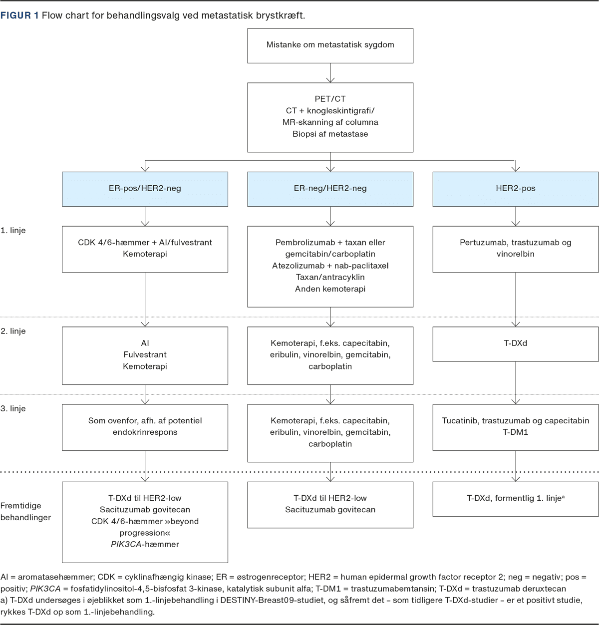 DBCG og internationale retningslinjer anbefaler som førstelinjebehandling en kombination af antistofferne trastuzumab og pertuzumab sammen med kemoterapi. Behandlingen med dobbeltblokade af HER2-receptoren gav i CLEOPATRA-studiet en overlevelsesforbedring på medialt 16 måneder sammenlignet med trastuzumab og kemoterapi alene, og man fandt en medianoverlevelse i den eksperimentelle arm på 57,1 (95% konfidens-interval (KI): 50,0-72,0) måneder [15]. Internationalt bruges oftest et taxan som docetaxel eller paclitaxel, mens vi i Danmark bruger vinorelbin pba. et nordisk initieret studie, som viste samme effekt som docetaxel, men gav færre bivirkninger [16].