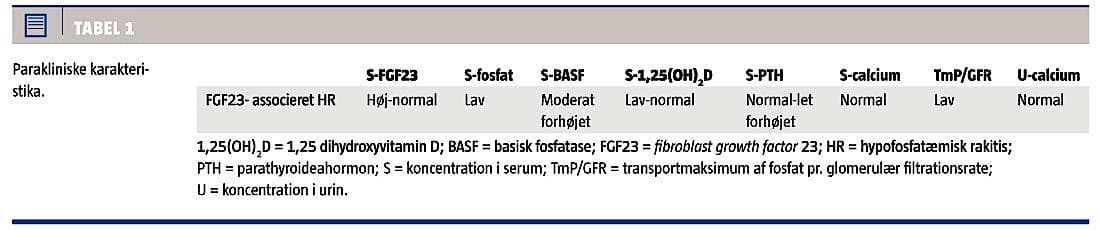 Paraklinisk ses hypofosfatæmi og nedsat renalreabsorption af fosfat (Tabel 1). S-1,25(OH)2D-niveauet er normalt til lavt, og S-FGF23-niveauet er forhøjet hos de fleste patienter. De FGF23-associerede HR-undergrupper ligner hinanden paraklinisk, men adskiller sig fra nutritiv rakitis ved at have normalt S-calcium- og S-25-hydroxyvitamin D-niveau, hvorimod S-PTH-niveauet i nogle tilfælde er let forhøjet [5, 6]. Et element af nutritiv rakitis på debuttidspunktet kan dog sløre diagnosen.