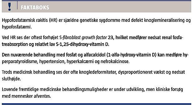 Hypofosfatæmisk rakitis (HR) omfatter hereditære rakitisformer med en samlet incidens på 3,9 pr. 100.000 levendefødte børn [1]. Sygdommene er karakteriseret ved hypofosfatæmi pga. renalt fosfattab, defekt knoglemineralisering og rakitis. HR opstår ved mutationer i gener, der har betydning for knoglemineraliseringen og fosfathomøostasen. Som følge heraf er S-fibroblast growth factor 23 (FGF23) ofte forhøjet, hvilket karakteriserer FGF23-associeret HR. Ved den sjældne HR med hyperkalcuri er S-FGF23 dog ikke forhøjet. Forbedret medikamentel behandling er efterspurgt, da den nuværende behandling ofte ikke er tilfredsstillende og hyppigt medfører komplikationer.