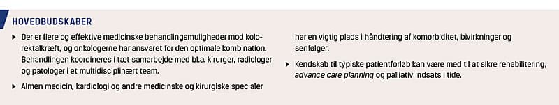 De fleste danske læger møder i løbet af et år en af de ca. 5.000 patienter med nydiagnosticeret kolorektalkræft eller et af de 30.000 mennesker [1], der har eller har haft sygdommen. Formålet med denne artikel er at give en pragmatisk, dansk status over standardbehandlinger. Desuden vil den nyeste udvikling inden for den medicinsk onkologiske behandling blive beskrevet. Det er håbet, at især patienternes egen læge og andre involverede sygehusspecialer får et indtryk af de forløb, som typiske patienter gennemgår på en onkologisk afdeling. Artiklen vil derfor tage udgangspunkt i tre almindelige forløb: En patient, der får behandling efter operation, en patient, der får medicinsk behandling før operation, og en patient, der er i livsforlængende behandling. Den nyeste udvikling præges dels af forbedrede biomedicinske muligheder, og dels af lægens muligheder for at optimere patientforløbet.
