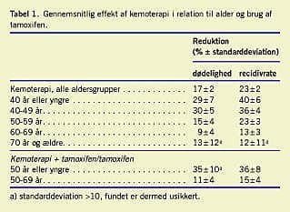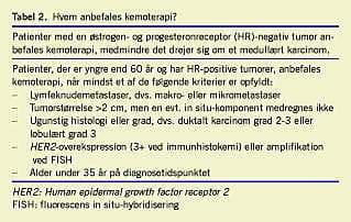 EBCTCG's 2005-publikation viser, at der er effekt af kemoterapi i alle de undersøgte undergrupper. Den relative reduktion i risikoen for recidiv er således den samme, uafhængigt af f.eks. spredning til de regionale lymfeknuder og hormonreceptorstatus [4]. En undtagelse har tidligere været alder, idet effekten af CMF aftog med stigende alder. En tilsvarende aldersrelation er ikke vist for antracykliner eller taxaner (Tabel 1 ). I en retrospektiv opgørelse af seks forsøg, der tilsammen omfattede 11.669 patienter, var der ingen effekt af at tillægge CMF til tamoxifen hos patienter, der var over 60 år og havde hormonreceptorpositive tumorer [10]. Mens den relative effekt tilnærmelsesvis er konstant på tværs af de prognostiske grupper, afhænger den absolutte effekt af prognosen. DBCG har med udgangspunkt i resultaterne fra konsensuskonferencen fra St. Gallen udarbejdet kriterier, der bruges til udvælgelse af de patienter, der bør tilbydes kemoterapi (Tabel 2 ). Ud over prognosen tages der i anbefalingerne også hensyn til effekten af de kendte behandlinger. Den absolutte reduktion i dødeligheden er for kemoterapi således mindre end 2% hos patienter, der er over 59 år og modtager endokrin terapi efter operation for en hormonreceptorpositiv tumor. Tamoxifen er nu helt eller delvist erstattet af aromatasehæmmere, og det er uafklaret, om dette fører til en relativ ændring i effekten af kemoterapi. Inden det besluttes at anbefale kemoterapi til en patient med brystkræft, bør prognosen uden kemoterapi derfor vurderes, også selv om dette ikke er uden faldgruber.