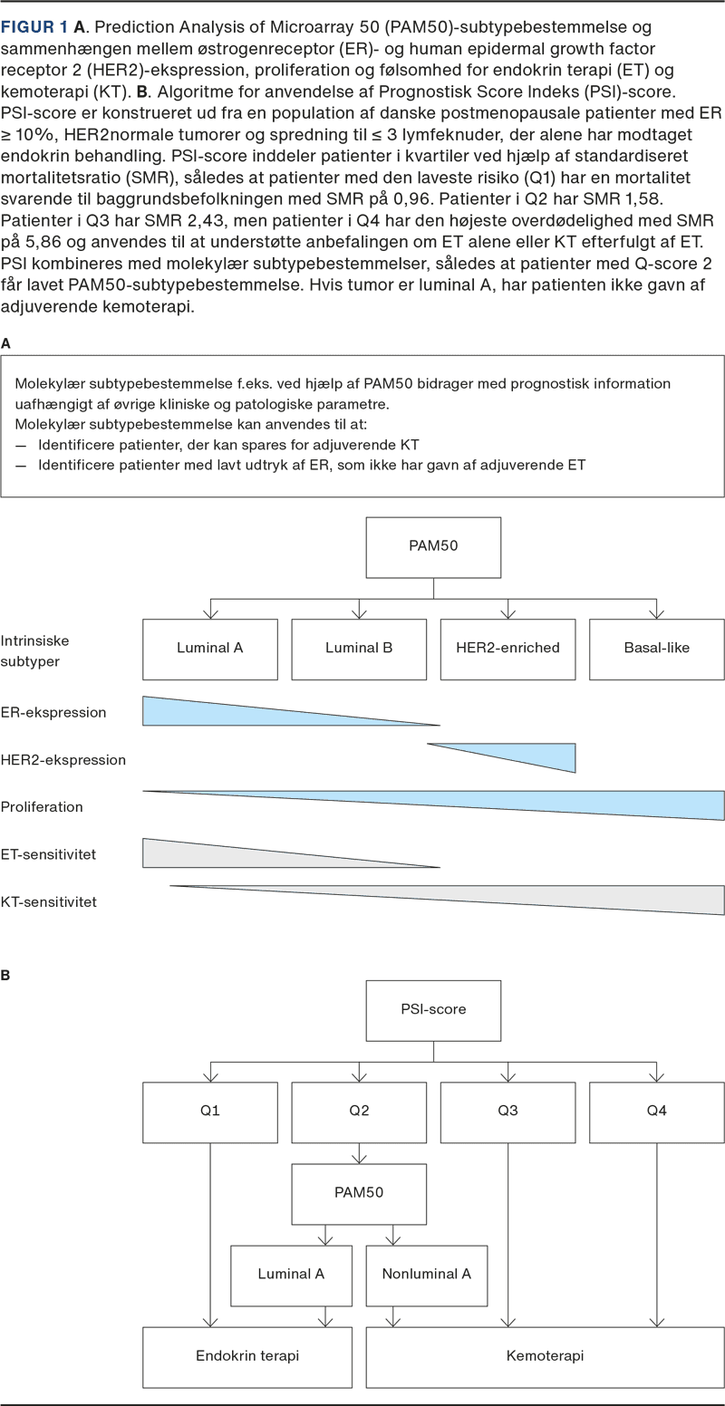 Prognostisk Score Indeks-score [9] (Figur 1 B) og molekylær subtypebestemmelse (Figur 1 A) anvendes til at identificere postmenopausale patienter, som ikke har gavn af adjuverende kemoterapi, og dermed kan behandlingen deeskaleres for ca. 200 patienter årligt [10].