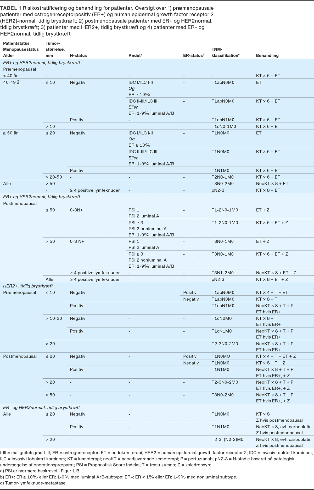 Brystkræft kan inddeles i flere subtyper med udgangspunkt i udtryk af østrogenreceptor (ER) og HER2 i tumorcellerne og genekspressionsprofiler f.eks. Prediction Analysis of Microarray 50 (PAM50) (Figur 1 A). Behandlingsvalg afhænger af subtype, individuel risikostratificering (Tabel 1) og komorbiditet, hvor effekten af behandlingen skal afvejes over for den samlede bivirkningstyngde, som behandlingen medfører. Patientens præferencer inddrages, inden der træffes en fælles beslutning om behandling.