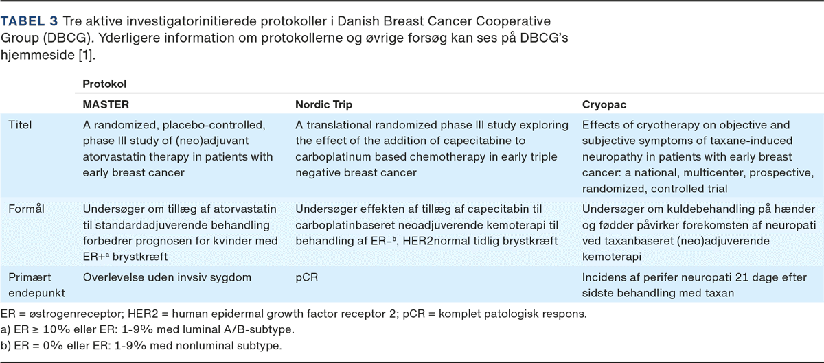 Danmark deltager i internationale studier omkring nye lægemidler og understøttende behandling. Derudover har DBCG siden grundlæggelsen i 1976 selv eller i samarbejde med andre initieret nationale/internationale protokoller med henblik på at optimere den (neo)adjuverende behandling. Aktuelle studier er beskrevet i Tabel 3 og på DBCG’s hjemmeside.