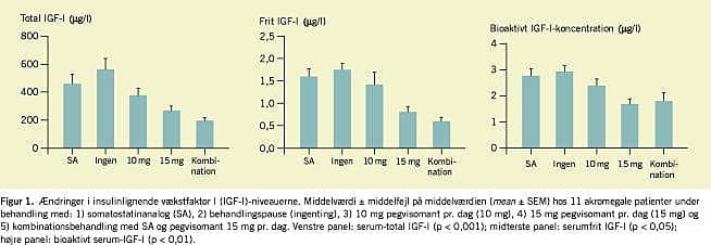 I et samarbejde mellem fire danske universitetsafdelinger blev der fundet 11 akromegale patienter (fire kvinder og syv mænd med en gennemsnitsalder på 46 år) med fortsat sygdomsaktivitet efter konventionel behandling. Ni patienter var tidligere opereret, og fem patienter havde modtaget strålebehandling. Ved starten var ti patienter i behandling med SA i maksimal dosis. Patienterne blev undersøgt efter fem forløb i følgende rækkefølge: 1) konventionel SA-behandling, 2) to måneders SA-pause, 3) seks ugers pegvisomantbehandling (10 mg pr. dag, 4) seks ugers pegvisomantbehandling (15 mg pr. dag), 5) tre måneders behandling med både SA og pegvisomant (15 mg pr. dag).