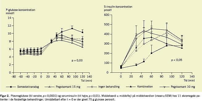 Det er tidligere vist, at pegvisomant sænker de fastende serumniveauer for glukose og insulin [6], hvilket afspejler væksthormons insulinantagonistiske effekter. Vi observerede tillige en forbedring af glukosetoleransen, som var ledsaget af en moderat øgning i den stimulerede insulinsekretion. Forklaringen på sidstnævnte er sandsynligvis, at væksthormonblokade reducerer den kroniske stimulation af β -cellerne, hvilket vides at genoprette insulinresponset på akut glukoseeksposition [7]. Eftersom somatostatin hæmmer sekretionen af både væksthormon og insulin, er effekten af behandling med SA på glukosetoleransen mindre forudsigelig. Hos vores selekterede patientgruppe syntes sidstnævnte behandling at forværre glukosetoleransen. Under kombinationsbehandlingen blev glukosetoleransen forbedret sammenlignet med ved SA-behandling alene.