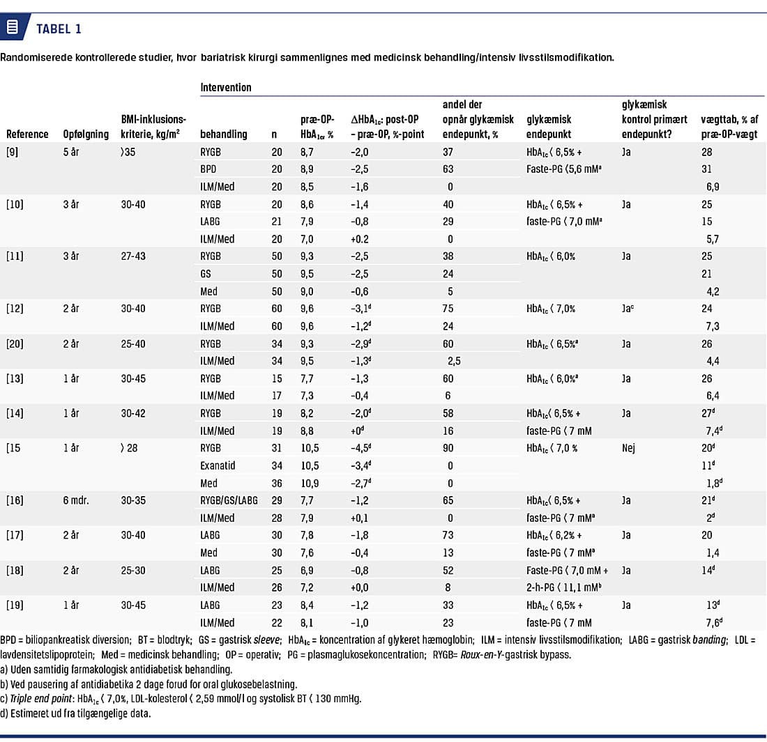 Der er publiceret resultater fra 12 klinisk kontrollerede studier (Tabel 1) [9-20], hvor svært overvægtige patienter med type 2-diabetes er randomiseret til enten bariatrisk kirurgi eller medicinsk behandling. I de fleste af studierne benyttedes RYGB (n = 9 studier), mens der i færre anvendtes GS (n = 2), LAGB (n = 5) eller biliopankreatisk diversion (BPD) (n = 1), hvoraf sidstnævnte ikke udføres i Danmark. Den medicinske behandling varierede imellem studierne; i nogle blev patienterne behandlet efter vanlige retningslinjer, mens der i andre blev anvendt et mere intensivt medicinsk behandlingsregime med eller uden samtidig livsstilsintervention. Patientantallet i behandlingsgrupperne varierede fra 15 til 60, og opfølgningen var fra et til fem år. Studiepopulationerne varierede i diabetesvarighed (lang vs. kort) og glykæmisk kontrol (velreguleret vs. dysreguleret), ligesom graden af fedme varierede (BMI over vs. under 35 kg/m2). Endelig varierede endepunkterne, som i nogle studier var glykæmisk kontrol (HbA1c) og i andre remission af type 2-diabetes