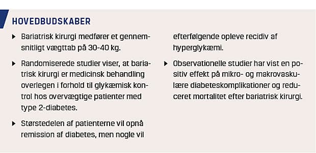 Bariatrisk kirurgi inducerer et stort og blivende vægttab. Randomiserede studier af bariatrisk kirurgi vs. medicin/livsstilsintervention til behandling af svært overvægtige patienter med type 2-diabetes viser samstemmende, at kirurgi resulterer i bedre glykæmisk kontrol end intensiv farmakologisk behandling. Derudover ses der i observationelle studier en reduktion af mikro- og makrovaskulære komplikationer samt reduceret mortalitet efter kirurgi.