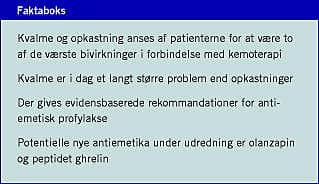Kvalme og opkastning anses af patienterne for at være to af de værste bivirkninger i forbindelse med kemoterapi. I denne oversigtsartikel vurderes udviklingen af antiemetika de seneste 12 år med fokus på neurokinin (NK) 1 -receptorantagonisten, aprepitant, og den nye serotonin (5-HT) 3 -receptorantagonist, palonosetron. Evidensbaserede anbefalinger for profylakse af kemoterapiinduceret kvalme og opkastning gives. Antiemetika er effektive til forebyggelse af opkastninger, men har mindre effekt på kvalme. Undersøgelser med potentielle nye antiemetika såsom olanzapin og ghrelin afventes derfor med spænding.