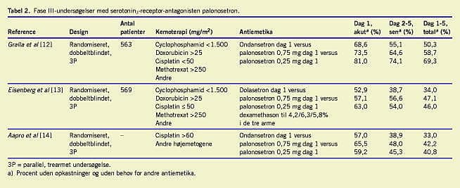 Palonosetron har ca. 100 gange højere affinitet for 5-HT3 -receptorer og længere halveringstid (40 timer vs. 4-9 timer) en d de andre serotoninantagonister. I to randomiserede, dobbeltblinde undersøgelser sammenlignede man palonosetron 0,25 mg givet i.v. og 0,75 mg givet i.v. med henholdsvis ondansetron 32 mg givet i.v. [12] og dolasetron 100 mg givet i.v. [13]; alle givet som en dosis før kemoterapi (Tabel 2 ). Palonosetron var lige så effektiv som dolasetron og bedre end ondansetron i behandlingen af akut kvalme og opkastning fra moderat emetogen kemoterapi og bedre end både dolasetron og ondansetron mod sen kvalme og opkastning [12, 13]. I en tredje undersøgelse (Tabel 2) var palonosetron lige så effektiv som ondansetron i behandlingen af akut kvalme og opkastning fra højemetogen kemoterapi [14]. Undersøgelserne har flere svagheder. De inkluderede både kemoterapinaive patienter og patienter, der tidligere havde fået kemoterapi, anvendte non inferiority- design, og den evidensbaserede behandling ville have nødvendiggjort tillæg af steroid, hvilket kun var kun tilfældet hos henholdsvis 0% [12], 5% [13] og 67% [14]. Undersøgelserne var ikke designet med henblik på at undersøge sen kvalme og opkastning. Palonosetron har således potentielle fordele, men der mangler undersøgelser udført i henhold til rekommandationerne i de kliniske retningslinjer, før det med sikkerhed kan afgøres, om palonosetron har kliniske fordele sammenlignet med andre serotoninantagonister [7, 15].
