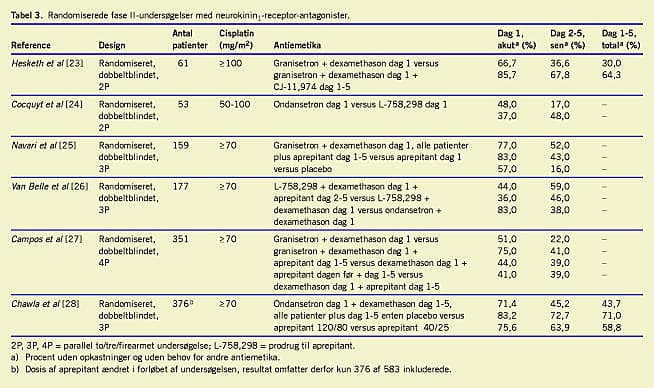 Der er ingen publicerede fase I-undersøgelser med aprepitant. I Tabel 3 ses randomiserede fase II-undersøgelser med neurokininantagonister [23-28], herunder dem [24-28], hvori man har undersøgt effekten af aprepitant (eller prodrug ) ved cisplatininduceret kvalme og opkastning. Undersøgelserne afklarede flere problemstillinger, men efterlod også ubesvarede spørgsmål. I tre undersøgelser sammenlignede man en neurokininantagonist med en serotoninantagonist mod akut kvalme og opkastning fra cisplatin [24, 26, 27]. Patienter i behandling med en neurokininantagonist klarede sig dårligere end patienter, der fik serotoninantagonistbaseret antiemetika. Resultaterne af tre undersøgelser [25, 27, 28] viste, at tillæg af aprepitant til standardbehandling med serotoninantagonist plus dexamethason bevirkede signifikant færre opkastninger i første døgn. Aprepitant kan altså ikke erstatte en serotoninantagonist i første døgn efter kemoterapi, men bevirker en signifikant øgning af effekten af serotoninantagonist plus dexamethason. Resultaterne af alle seks undersøgelser viste, at en neurokininantagonist har effekt på antallet af opkastninger dag 2-5. I en af undersøgelserne fandt man ingen forskel i effekt dag 2-5 hos patienter, der fik henholdsvis en dags og fem dages behandling med aprepitant [25]. I løbet af fase II blev det klart, at aprepitant pga. interaktion via CYP3A4 øger biotilgængeligheden af oral dexamethason. Dosis af oral dexamethason blev derfor reduceret til 50-60% i fase III-undersøgelsernes aprepitantarm [28].