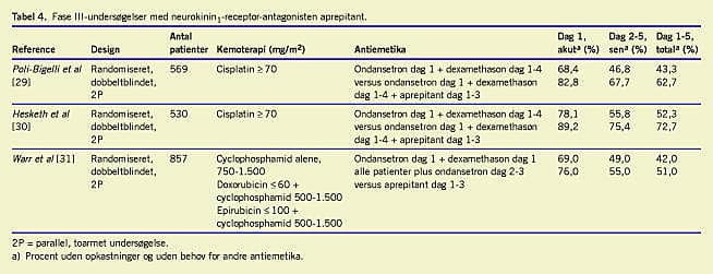 I to fase III-undersøgelser med identisk design (Tabel 4 ), randomiserede man tilsammen 1.099 patienter, der skulle påbegynde behandling med cisplatinbaseret kemoterapi [29, 30]. I undersøgelserne sammenlignede man ondansetron 32 mg givet i.v. plus dexamethason 20 mg givet p.o. dag et, efterfulgt af dexamethason 8 mg × 2 givet p.o. dag 2-4 med ondansetron 32 mg givet i.v. plus dexamethason 12 mg givet p.o plus aprepitant 125 mg givet p.o. dag et, efterfulgt af dexamethason 8 mg givet p.o. dag 2-4 plus aprepitant 80 mg givet p.o. dag 2-3. I begge undersøgelser bevirkede aprepitant en ca. 20% øgning i antallet af patienter uden opkastninger og uden behov for yderligere antiemetika (CR) i de første fem døgn (62,7% vs. 43,3%, p < 0,001 [29] og 72,7% vs. 52,3%, p < 0,001 [30]). I den ene undersøgelse [29] bevirkede tillæg af aprepitant tillige en 10% statistisk signifikant øgning i antallet af patienter uden kvalme dag 1-5 (48,8% vs. 38,8%, p < 0,05). Der var ingen signifikante forskelle i bivirkninger.