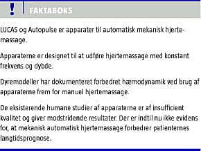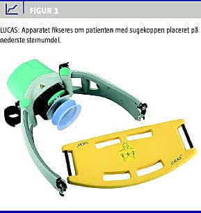 Hjertemassagens kvalitet og starttidspunkt er afgørende for patientens prognose. Hvert minut uden hjerte-lunge-redning forringer overlevelseschancen med 10%. Det er dokumenteret, at selv erfarent sundhedspersonale ikke kan efterleve anbefalinger vedrørende massagens frekvens, dybde og kontinuitet [2]. Dette faktum har medført en stigende interesse for automatisk mekanisk hjertemassage (A-CPR), der i teorien opfylder de konkrete kvalitetsmål for korrekt udførelse, men samtidig indebærer en risiko for betydelige pauser i hjerte-lunge-redning under tilkobling af apparaturet. To fuldautomatiske transportable hjertemassageapparater er blevet godkendt til distribution af Food & drug Administration i USA; Autopulse (Zoll Circulation) og Lund University Cardiopulmonary Assist System (LUCAS) fra Jolife. I Danmark findes LUCAS (Figur 1 ) og Autopulse (Figur 2 ) på flere hospitaler og akutlægebiler. I denne statusartikel belyses apparaternes undersøgte effekt på prognosen ved hjertestop og desuden diskuteres deres fremtidige plads i avanceret genoplivning.