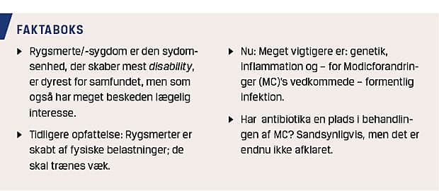 I hvert fald er der med dagens cytokinviden tale om et ændret syn på rygsygdom, hvilket sammen med MC synes at have ført rygsygdom fra tidligere tiders fysiske belastninger frem mod, at inflammation/infektion spiller store roller [25, 30]. Foreløbig har resultaterne af behandling ved diskusprolaps (ben-smerter) med anticytokiner dog ikke givet grund til så megen optimisme, som det først så ud til, og ved ryg-smerte er undersøgelser stadig i sin vorden.