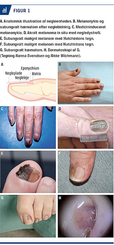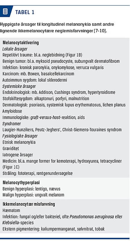 Melanonykia er en tilstand, der er karakteriseret ved melaninpigment i neglen. Det ses typisk som en brun eller sort stribe gennem hele neglens længde fra neglematrix og distalt til neglens frie kant, såkaldt longitudinel melanonykia (LM). Figur 1A viser den normale negleenhedens anatomi. I den normale negleenhed findes der en væsentligt højere densitet af melanocytter i neglematrix end i neglelejet [1, 2]. Stimulering af melanocytter medfører en øget mængde melanin i neglematrix, og det inkorporeres i neglen i takt med, at denne vokser ud. Herved dannes et længdegående bånd af melanin i hele neglens længde. LM ses ved benign melanocythyperplasi i neglematrix (ungvalt nævus, lentigo), melanocytaktivering ved lokal eller generel hypermelanosis (infektioner, traumer, medicin) og ved malign proliferation (subungvalt melanom) [3]. Prævalensen for LM er hos kaukasider 1-2%, men det ses hyppigere hos personer med mørkere hudtyper [4, 5]. LM er ligeligt fordelt mellem kønnene [6] med en stigende prævalens med alderen [5]. Tabel 1 viser de mest almindelige årsager til LM og de hyppigste ikkemelanocytære misfarvninger, der kan ligne LM. Generelt set vil mørke misfarvninger, der er opstået i neglelejet eller distalt i neglen, ikke stamme fra melanin [7], selvom der findes beskrevne tilfælde [11]. Ikkemelanocytære misfarvninger kan dog fortsat give differentialdiagnostiske udfordringer i forhold til ungvalt melanom.