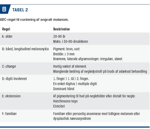 Almindeligvis har patienter med LM ingen symptomer. I udredningen af LM indgår en grundig anamnese og objektiv undersøgelse inklusive dermatoskopi. Anamnestisk bør der fokuseres på varigheden og udviklingen af misfarvningen i neglen, tidligere eller igangværende sygdomme, medicinbrug, tidligere traumer af neglen (inkl. neglebidning) og tidligere infektioner i området. I lighed med de kutane melanocytære element er der udviklet en ABC-regel til klinisk vurdering og dermatoskopi af LM [12] (Tabel 2). Der er ikke konsensus om, hvordan ABC-reglen skal bruges, men den giver et overblik over de forhold, der er associeret med malignitet. Ved den objektive undersøgelse noteres hudtypen (etnicitet) og lokalisationen af LM (hvilke finger-/tånegle er afficeret) samt eventuel periungval pigmentering (Hutchinsons tegn) og negledystrofi. Selve negleforandringen vurderes makroskopisk, hvor bredde og farve af de pigmenterede bånd (og variation heraf) beskrives. Grundlæggende vurderes det, om misfarvningen er af melanocytær eller nonmelanocytær oprindelse. Førstnævnte kan som tidligere nævnt være udtryk for subungvalt melanom, mens sidstnævnte typisk ses ved ungvale hæmatomer eller onykomykoser. Dermatoskopi kan i mange tilfælde være værdifuld og bidrage diagnostisk, da den muliggør skelnen mellem de melanocytære og nonmelanocytære misfarvninger. Metoden kræver erfaring, men kan medvirke til reducering af antallet af unødvendige biopsier. Dermoskopisk vurderes baggrundsfarven i LM samt regelmæssighed i farve, bredde og afstand mellem de linjer, der udgør båndet. Grå eller sort farve i kombination med brun pigmentering, irregulære parallelle bånd i neglens retning og granulær pigmentering er suspekt for melanom [13]. Ved dermatoskopi af den periungvale hud kan periungval pigmentering ses, før den bliver makroskopisk synlig (mikroskopisk Hutchinsons tegn). I de tilfælde, hvor der vælges en ekspekterende holdning, ses patienten til fornyet klinisk kontrol efter 2-3 mdr. Her kan ridsning af neglen (for at følge dens vækst i forhold til elementet) og kliniske fotos være meget anvendelige. En endelig diagnose kræver en biopsi af det melanocytære element. Ved LM skal biopsien således indeholde den del af neglematrix, der svarer til neglemisfarvningen. Da neglematrix skades ved biopsi er der en betydelig risiko for vedvarende negledystrofi. Tærsklen for biopsi af LM med ukendt genese bør dog være meget lav, især hvis det kun omfatter én negl og er bredere end 3 mm med brunlige og sorte nuancer. Det samme gælder, hvis LM kun omfatter én negl hos personer med lys hudtype, eller der er oplagte tegn til malignitet såsom periungval pigmentering, ulceration eller negledystrofi [14]. Hos børn, hvor malign genese er ekstremt sjælden, bør konsekvenserne af kirurgi nøje overvejes før biopsitagning, hvis der ikke er oplagte tegn til malignitet [15].