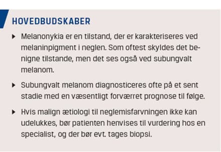 undersøge alle neglemisfarvninger grundigt og systematisk. Erfaringsmæssigt mistolkes årsagen til misfarvninger i neglen ofte, hvilket forsinker korrekt behandling og kan medføre en dårligere prognose. Ved tvivl om malign ætiologi bør patienten således henvises til vurdering hos en specialist. Alvorlige tegn til malignitet som Hutchinsons tegn eller ulcererende tumor bør medføre en direkte henvisning til et kræftpakkeforløb for malignt melanom.