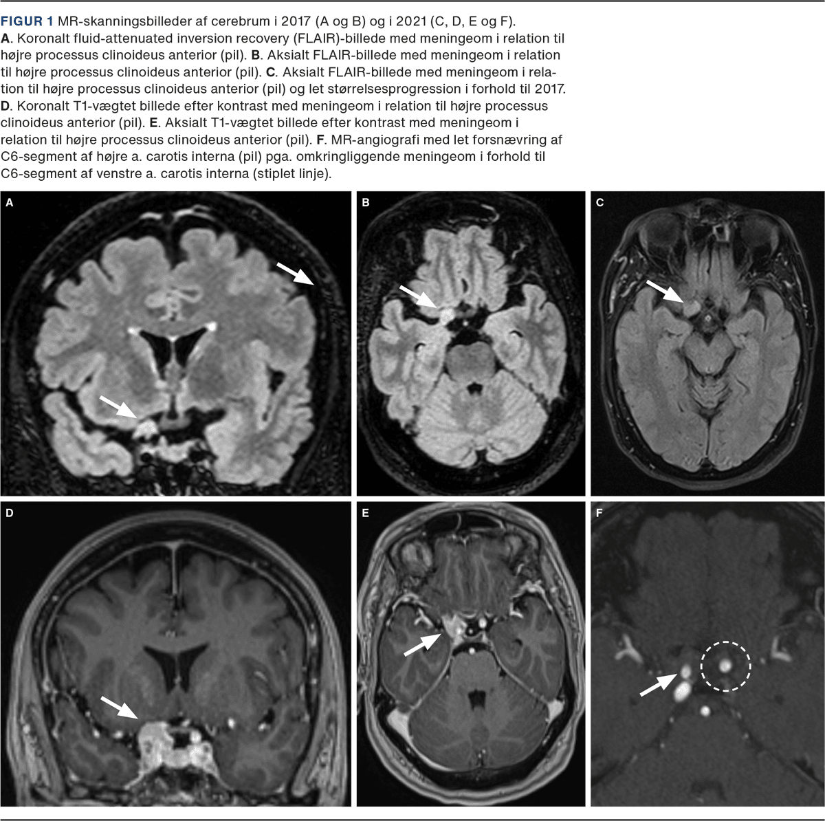 Dog blev der set en ekstraaksial forandring lokaliseret i relation til sella turcica på højre side. Der blev derfor undersøgt med MR-skanning af cerebrum med angiografi (Figur 1 C-F), hvor der sås en lille proces i relation til højre PCA, hvilket var foreneligt med meningeom, og ud fra beskrivelsen kunne det ses, at meningeomet også var synligt på de tidligere MR-skanninger, men var blevet overset. Der fandtes normale blodprøver og ingen halskaranomalier, kardial embolikilde, arytmi eller hyperkoagulable tilstande. Knap tre mdr. senere blev der foretaget kirurgisk fjernelse af et højresidigt meningeom ved PCA. Den seneste opfølgning var 16 mdr. efter indgrebet, og her var patienten symptomfri.