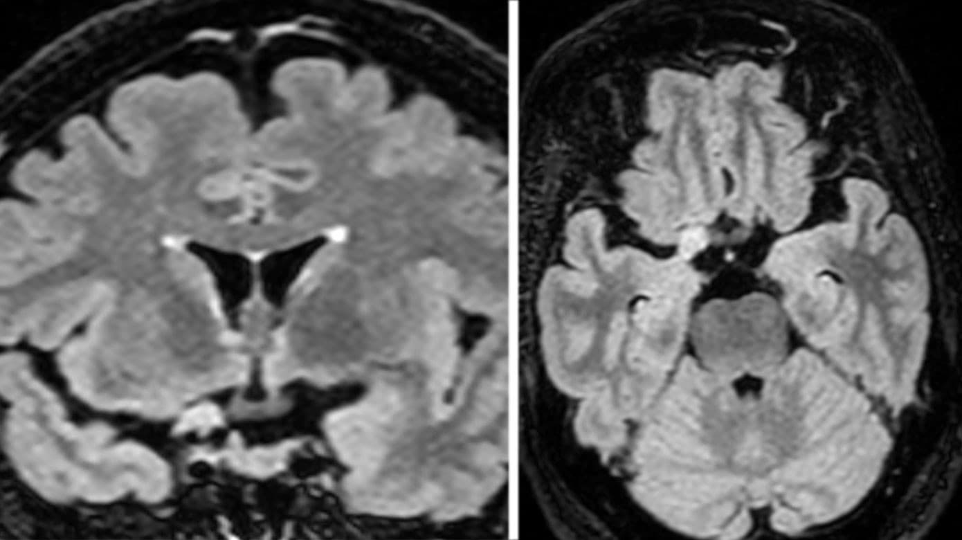 Patienten var en 54-årig kvinde, som tidligere var blevet diagnosticeret med hypertension og dyslipidæmi, havde haft to episoder af formodet vaskulær genese med ensidige sensomotoriske strokelignende symptomer og kraftig hovedpine. Man havde dengang fundet det i uoverensstemmelse med normale forhold på en MR-skanning af cerebrum Figur 1 A og B.